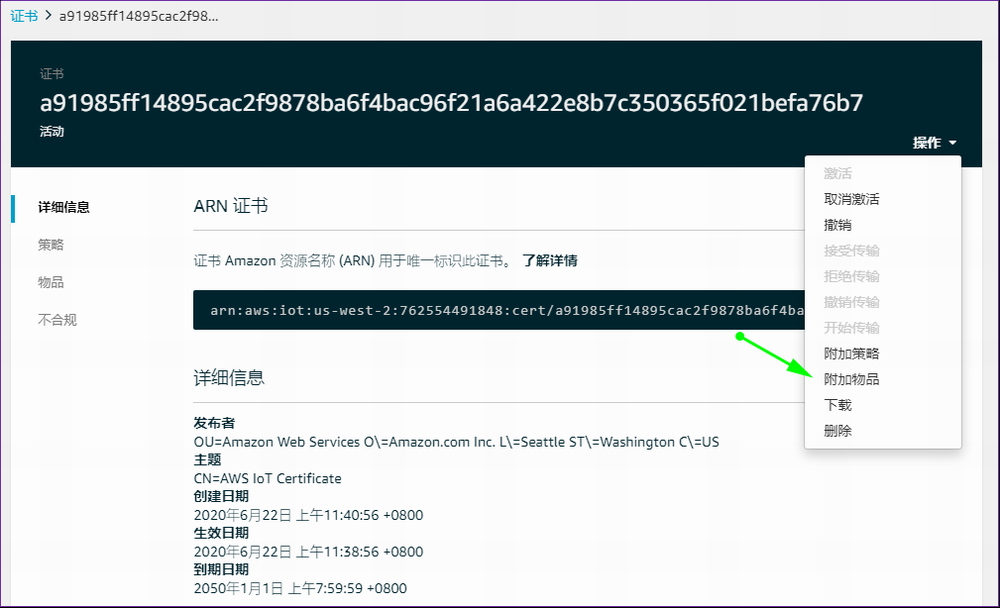 点击创建的物品,然后点击创建证书,保存下图中所示的4个证书,点击激活、完成