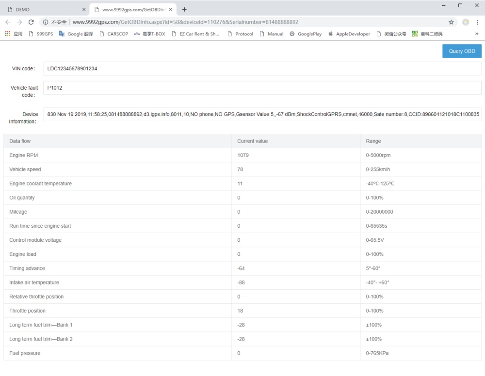 We upgrade www.999gps.net GPS tracking platform online OBD diagnostic to meet the client requirement for online OBD diagnostic, in the future the new design tracker(such as: CCTR-830G-4G etc.) with OBD interface can diagnostic the car status online, the following is an example in DEMO account: